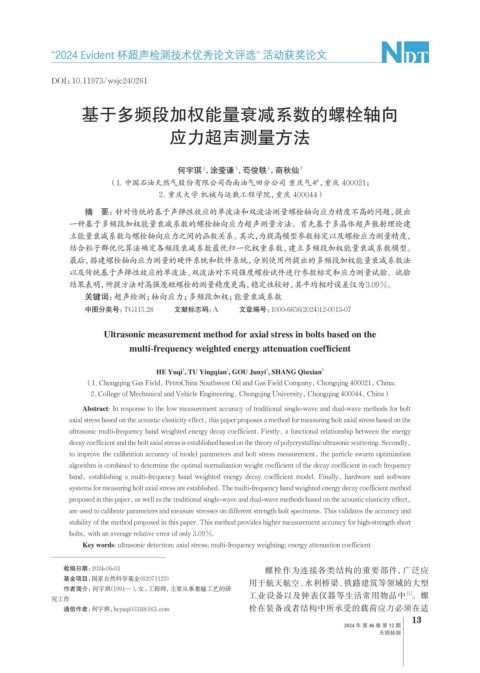 关键词:超声检测;轴向应力;多频段加权;能量衰减系数