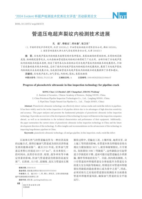 关键词:压电超声技术;油气管道;内检测;裂纹;类裂纹缺陷