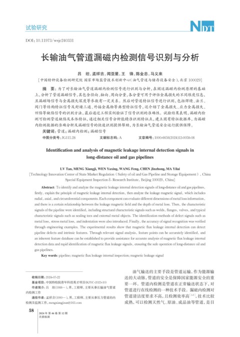 Abstract: To identify and analyze the magnetic leakage internal detection signals of long-distance oil and gas pipelines,