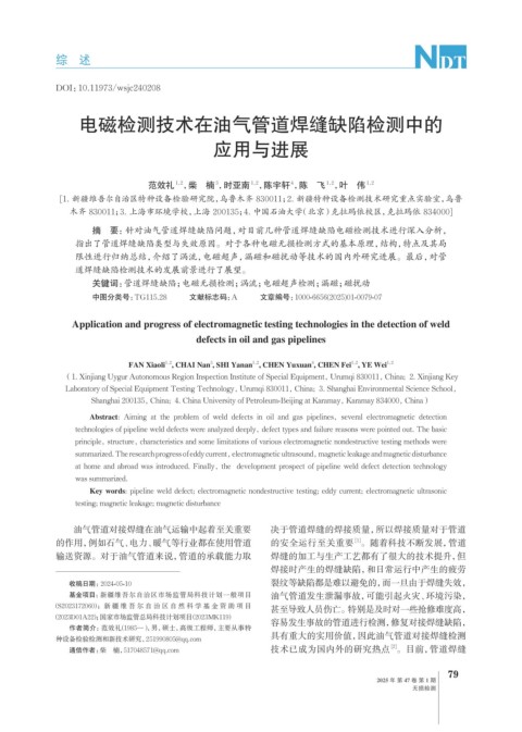 Key words: pipeline weld defect; electromagnetic nondestructive testing; eddy current; electromagnetic ultrasonic