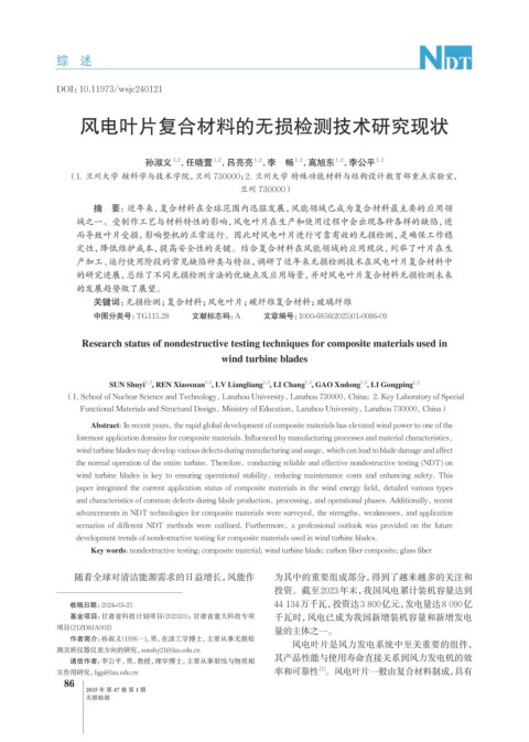 Key words: nondestructive testing; composite material; wind turbine blade; carbon fiber composite; glass fiber