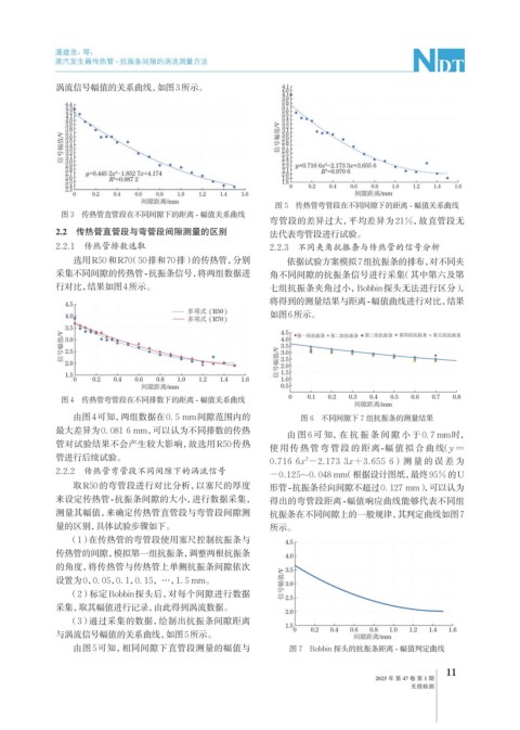 由图5可知,相同间隙下直管段测量的幅值与 图 7 Bobbin 探头的抗振条距离 - 幅值判定曲线