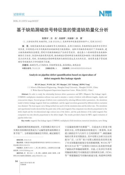 要手段 [1-2] 。分析缺陷的漏磁信号特征,确定缺陷尺 建立缺陷信号与几何尺寸之间的联系 [5-6] ,缺陷漏磁