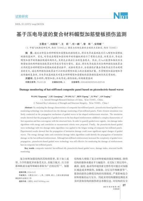 关键词:复合材料;帽型加筋;压电导波;损伤指数;结构健康监测