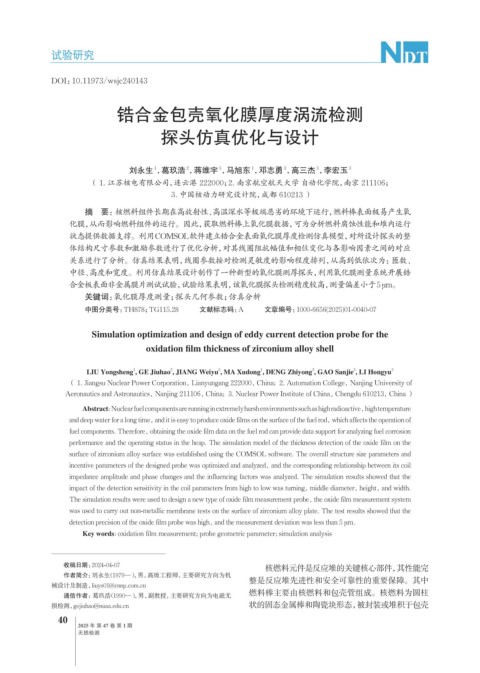 中径、高度和宽度。利用仿真结果设计制作了一种新型的氧化膜测厚探头,利用氧化膜测量系统开展锆
