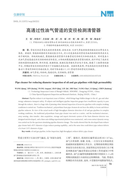 Key words: oil and gas pipeline; in-line inspection; high throughput; reducer defect; pipe cleaner