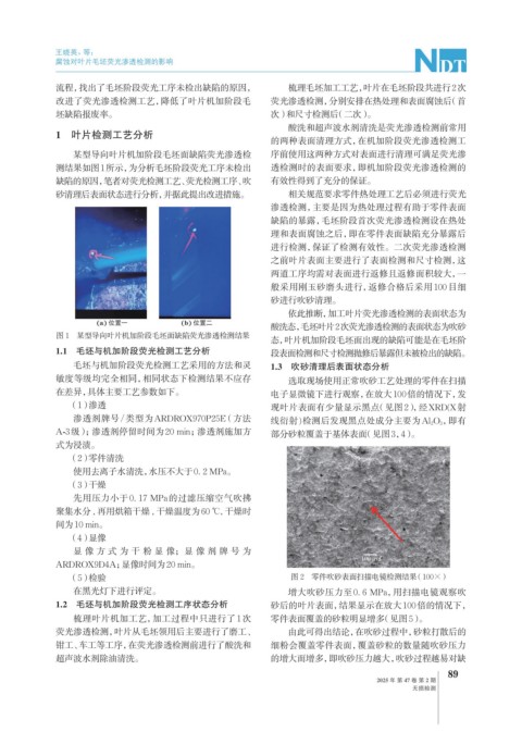 钳工、车工等工序,在荧光渗透检测前进行了酸洗和 细粉会覆盖零件表面,覆盖砂粒的数量随吹砂压力