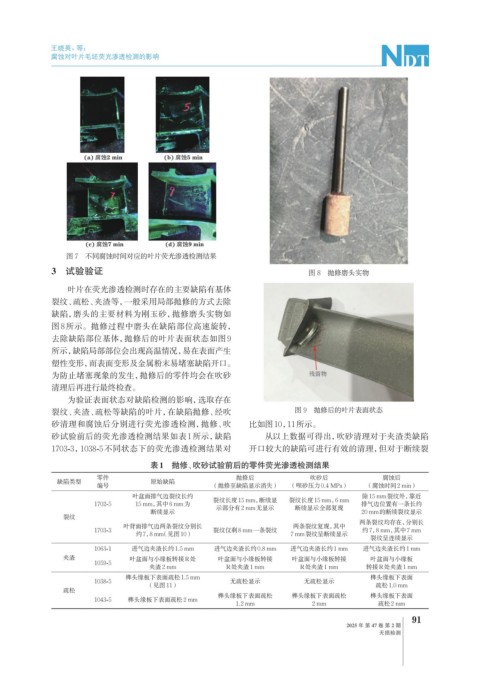 砂试验前后的荧光渗透检测结果如表1所示,缺陷 从以上数据可得出,吹砂清理对于夹渣类缺陷