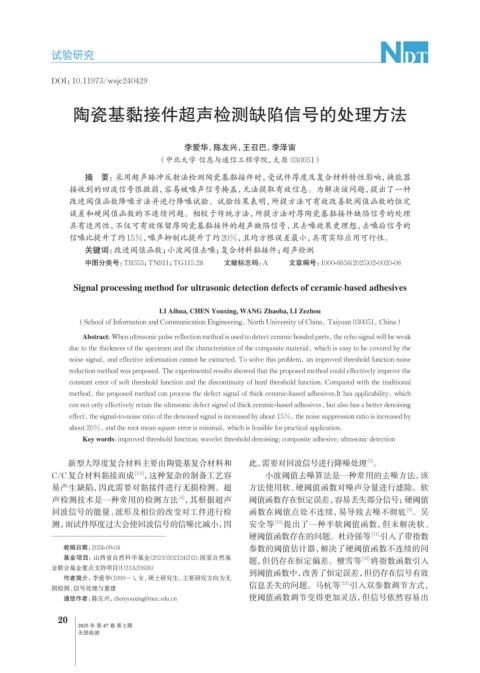 关键词:改进阈值函数;小波阈值去噪;复合材料黏接件;超声检测