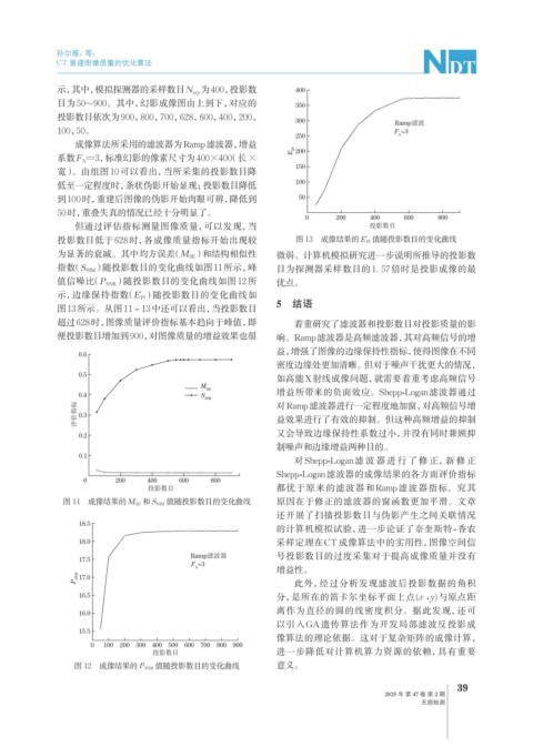 图 11 成像结果的 M SE 和 S SIM 值随投影数目的变化曲线 原因在于修正的滤波器的窗函数更加平滑。文章