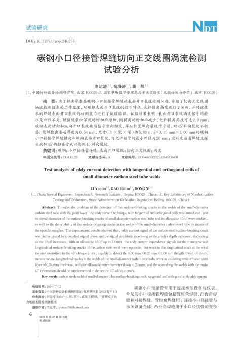 Key words: carbon steel; weld of small-diameter tube; surface-breaking crack; tangential and orthogonal coil; eddy current