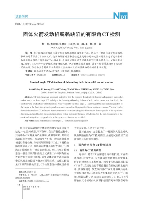 其内部会不可避免地产生脱黏、孔洞等缺陷,其中脱 脱黏缺陷有限角CT检测模型, 并通过试验验证了该