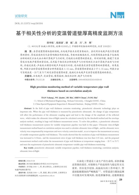 Key words: piezoelectric ultrasound; variable temperature pipeline; wall thickness monitoring; correlation analysis;