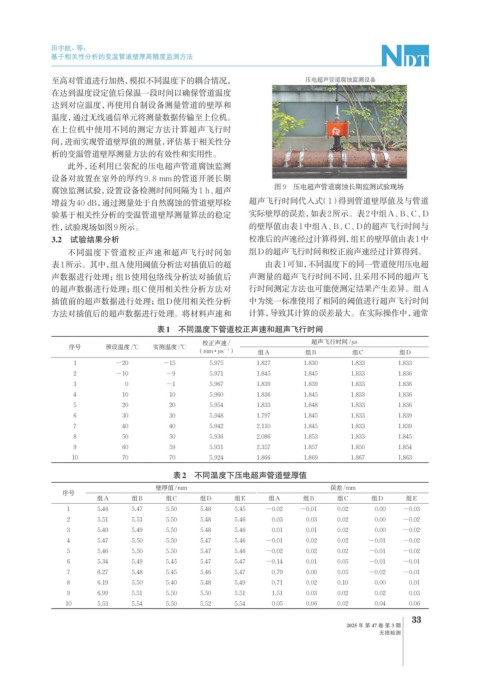 性,试验现场如图9所示。 的壁厚值由表1中组A、B、C、D的超声飞行时间与