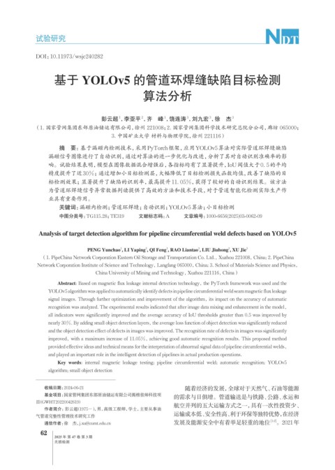 Key words: internal magnetic leakage testing; pipeline circumferential weld; automatic recognition; YOLOv5