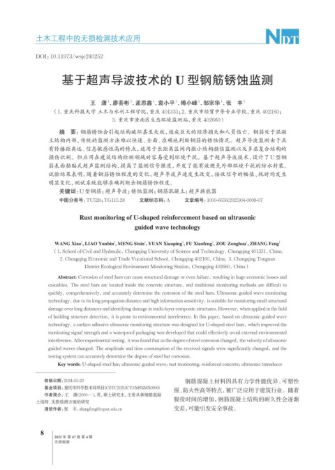 Key words: U-shaped steel bar; ultrasonic guided wave; rust monitoring; reinforced concrete; ultrasonic transducer