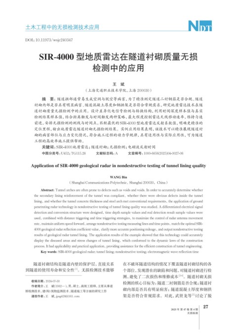 Key words: SIR-4000 geological radar; tunnel lining; nondestructive testing; electromagnetic wave reflection time
