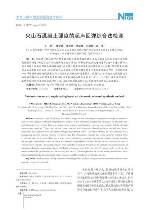 关键词:无损检测;超声回弹综合法;测强曲线;火山石混凝土;抗压强度