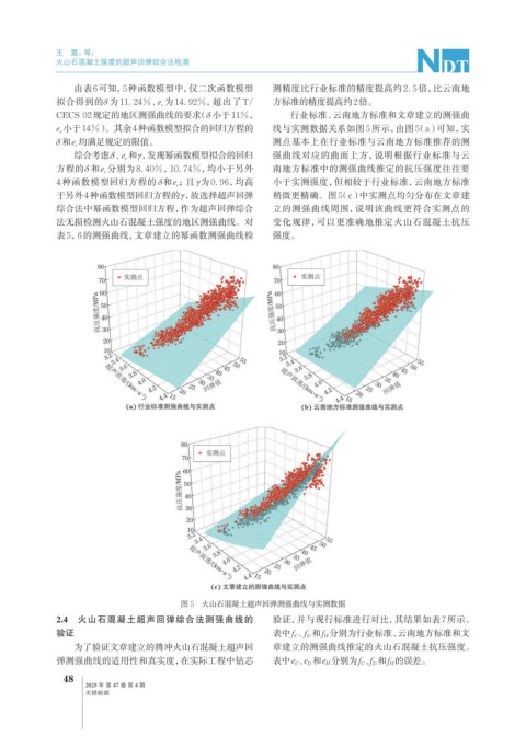 于另外4种函数模型回归方程的γ,故选择超声回弹 稍微更精确。图 5(c) 中实测点均匀分布在文章建